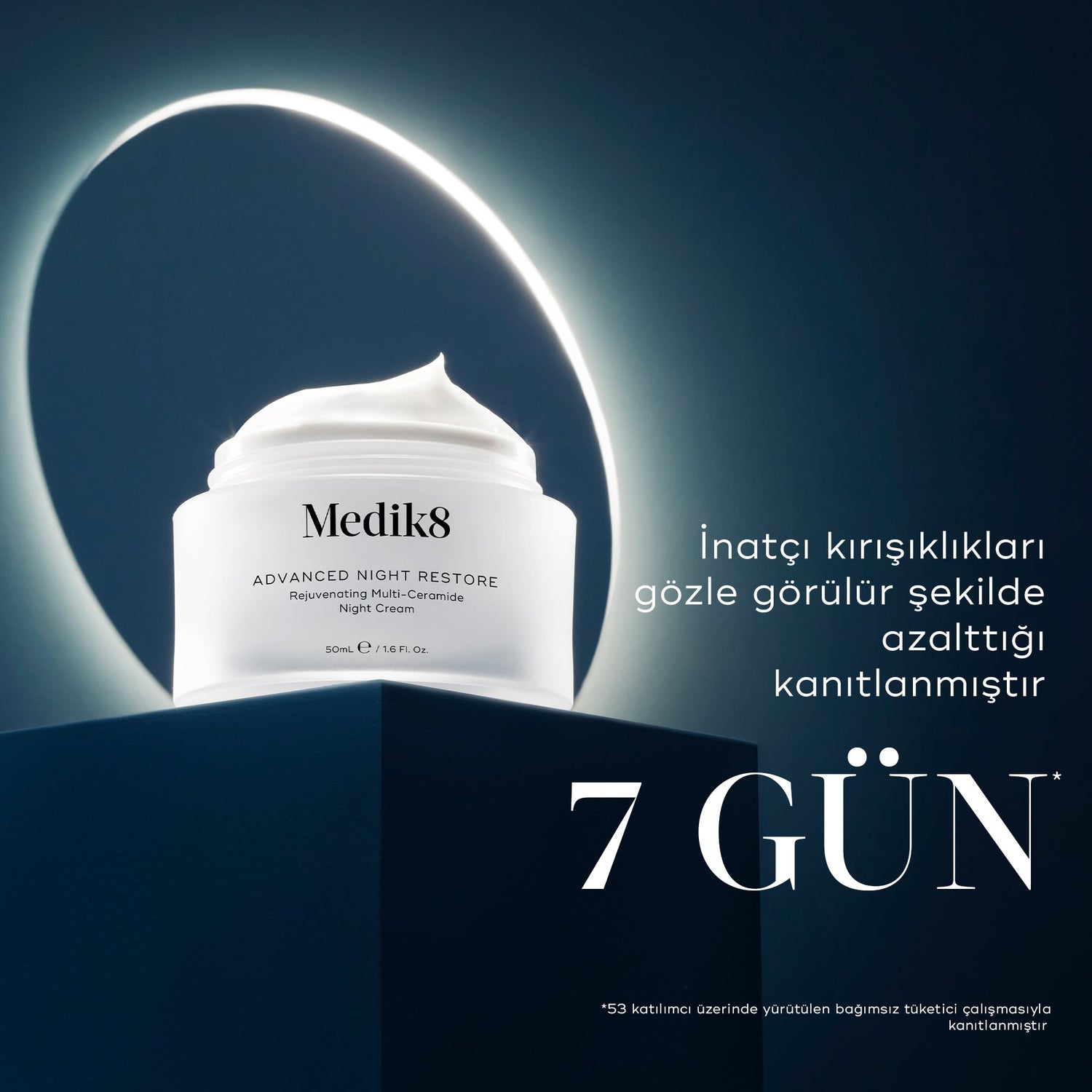 İnatçı çizgilerin ve kırışıklıkların görünümünü sadece 7 günde* yumuşattığı kanıtlanmış Medik8'in imza gece kremi, cildi dolgun ve yastık yumuşaklığında bırakır.
