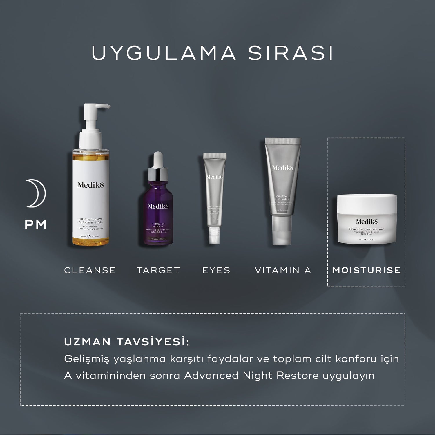 Zamanla kaybolan temel lipitleri yenileyerek Advanced Night Restore, gözle görülür bir dolgunlaştırma ve sıkılaştırma etkisinin yanı sıra maksimum cilt konforu sağlar.