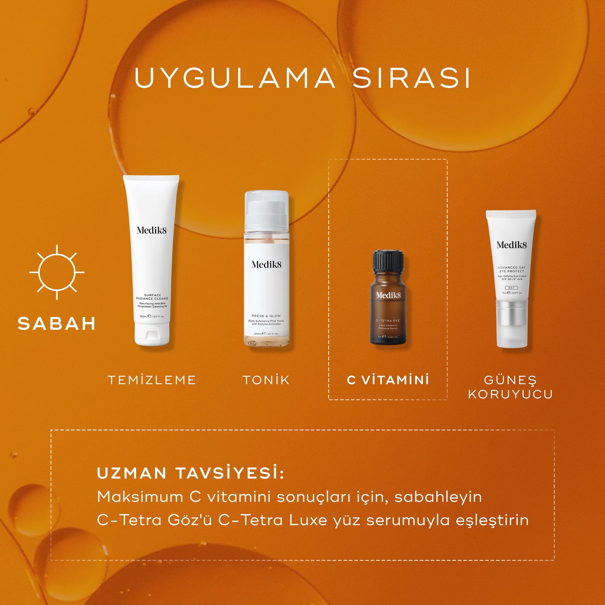Medik8'in yaşlanma karşıtı etkisi kanıtlanmış C-Tetra yüz serumlarının gücünü taşıyan C-Tetra Eye; hafif, hızlı emilen ve hassas göz çevreniz için yeterince nazik bir yapıyla güçlü görünür sonuçlar sunmak üzere özel olarak tasarlanmıştır.