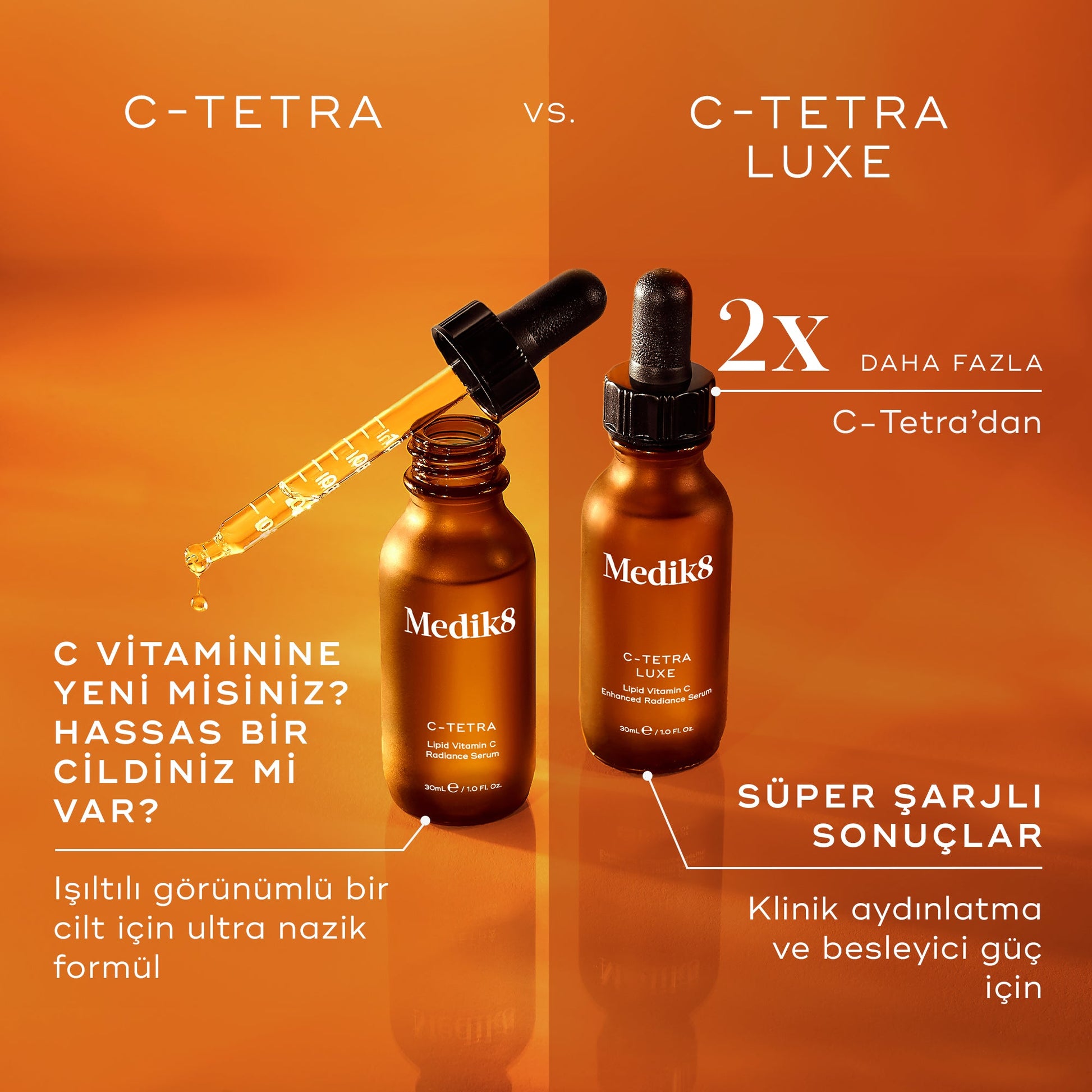 Orijinal C-Tetra serumumuzun iki katı miktarda (%14) C vitamini içeren C-Tetra Luxe, gelişmiş cilt ışıltısı ve antioksidan koruma arayanlar için mükemmel bir seçenektir, aynı zamanda derin beslenme sağlar.