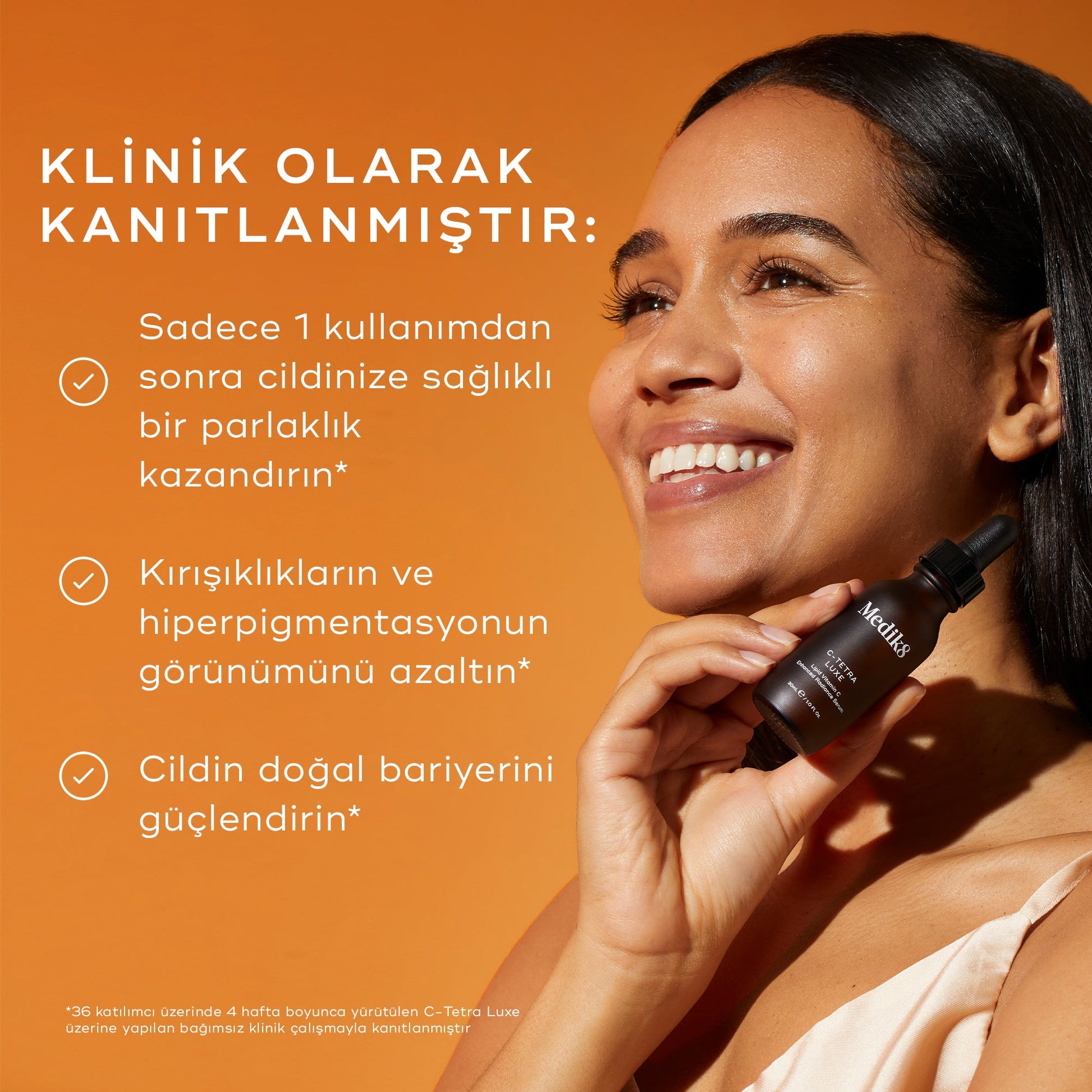 Her sabah cildinizin ışıltısını C-Tetra Luxe ile güçlendirin; sadece 4 hafta içinde kırışıklık ve hiperpigmentasyon görünümünü azaltmada klinik olarak kanıtlanmış etkisiyle.*