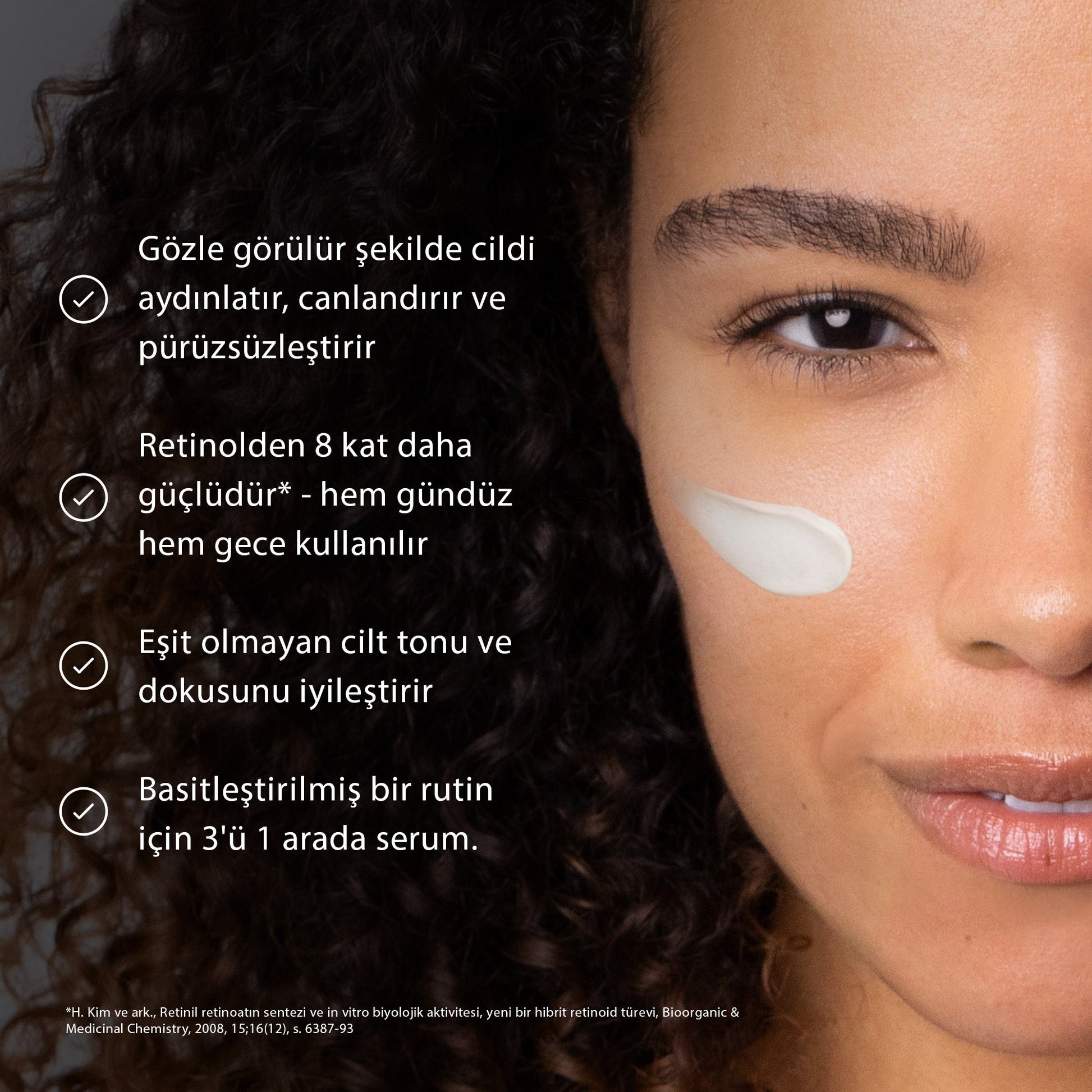Hem gündüz hem de gece kullanılabilen ve nazik kalırken daha hızlı görünür aydınlatma, canlandırma ve pürüzsüzleştirme sonuçları sağlayan olağanüstü A vitaminimiz.
