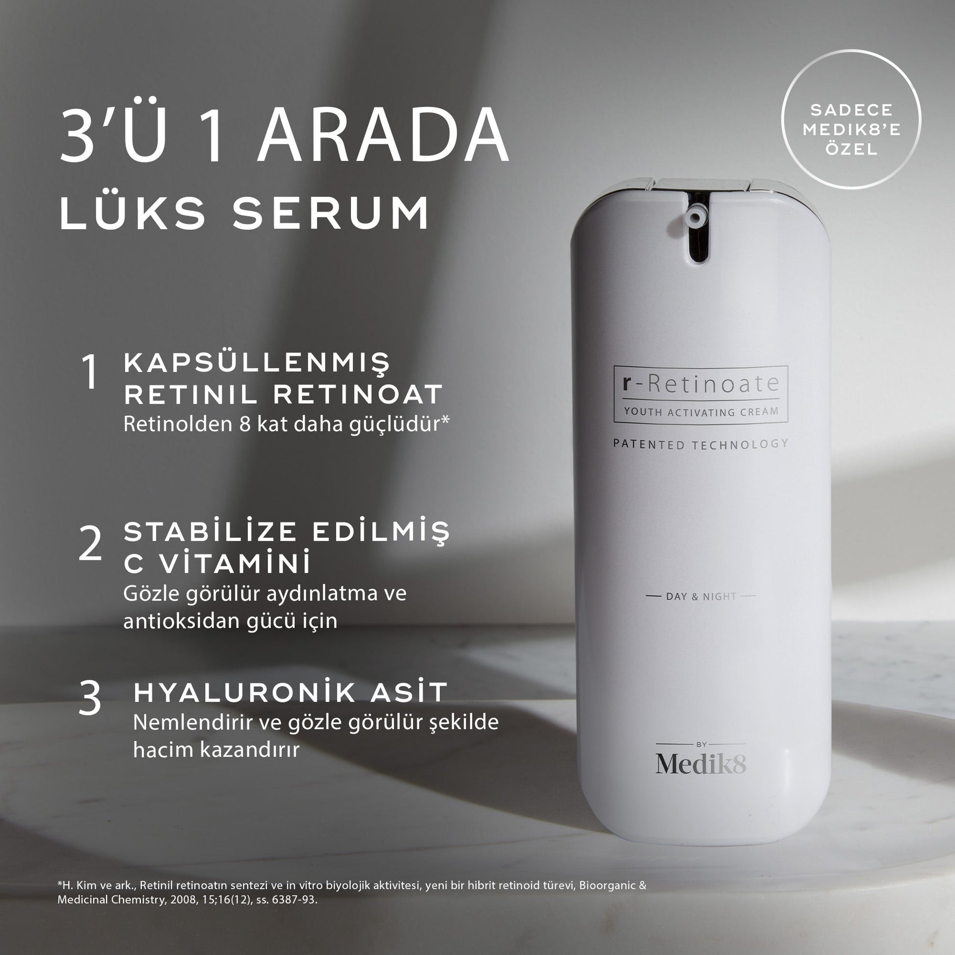 Bu lüks serum, Medik8'e özel kapsüllenmiş retinil retinoat ile desteklenmektedir - yaşlanmaya meydan okuyan faydalar sağlamada standart retinolden* 8 kat daha güçlü olduğu kanıtlanmıştır.