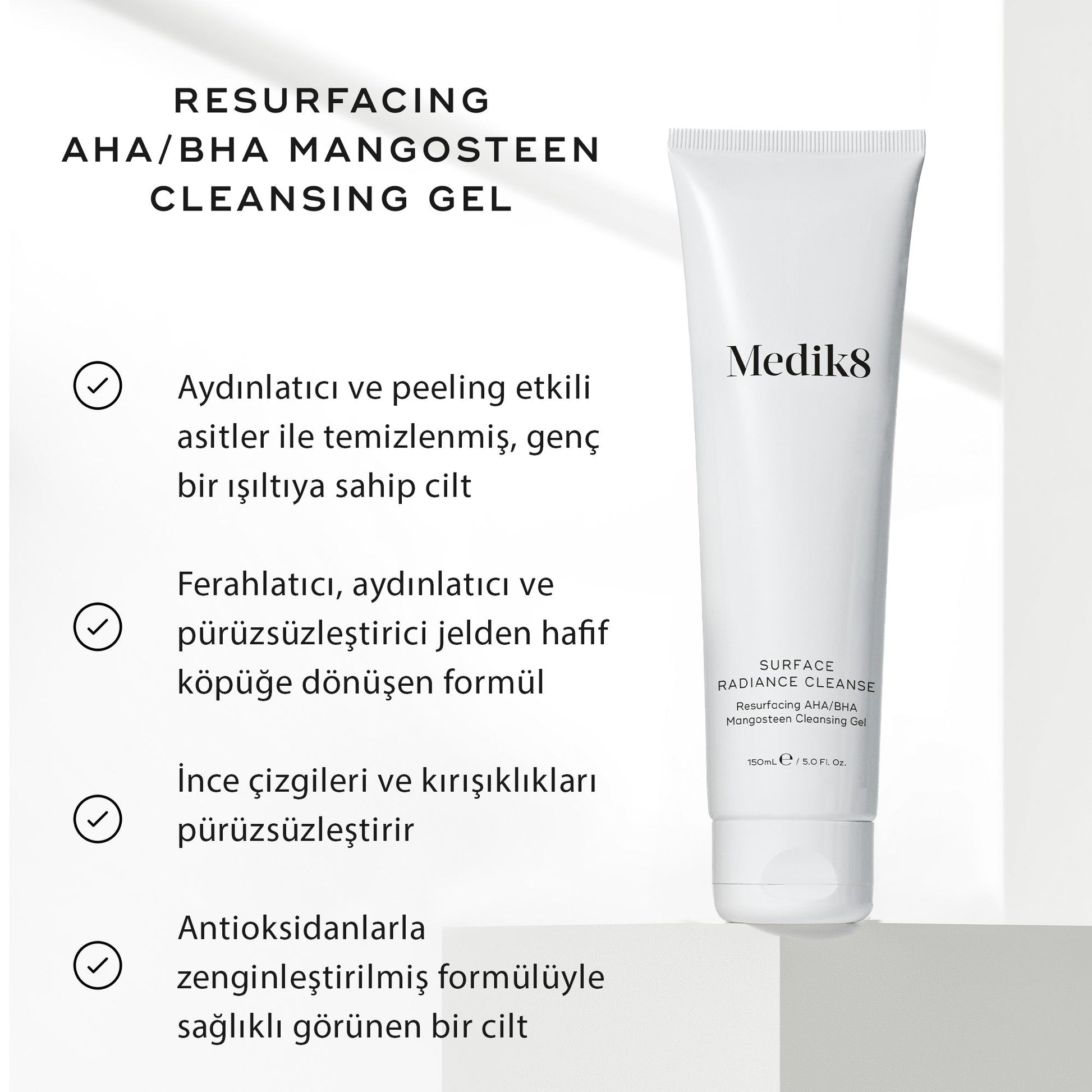 Surface Radiance Cleanse, özellikle yaşlanma, donukluk ve düzensiz doku belirtilerini gözle görülür şekilde iyileştirmeye çalışan tüm cilt tiplerinin etkili temizliği için benzersiz bir peeling AHA/BHA kompleksi içerir.